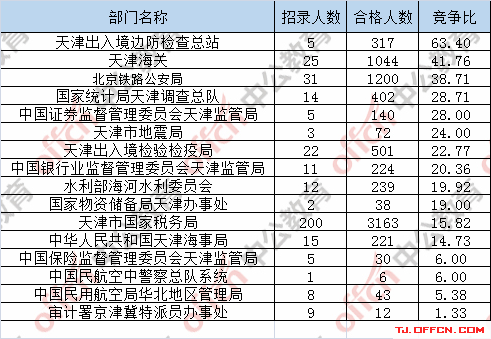 為幫助廣大考生更清晰的了解今日?qǐng)?bào)名情況,天津中公網(wǎng)校整理了審核通過人數(shù)前五位的部門以及競(jìng)爭(zhēng)比例最激烈的五大部門,供廣大考生參考:
