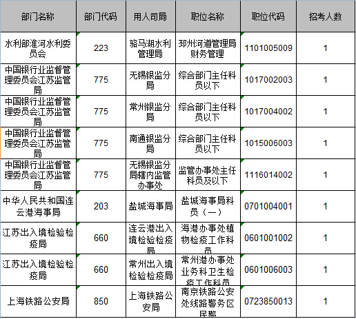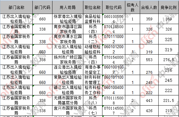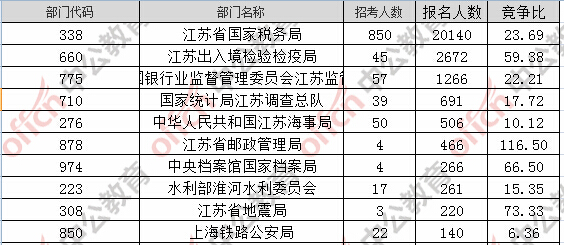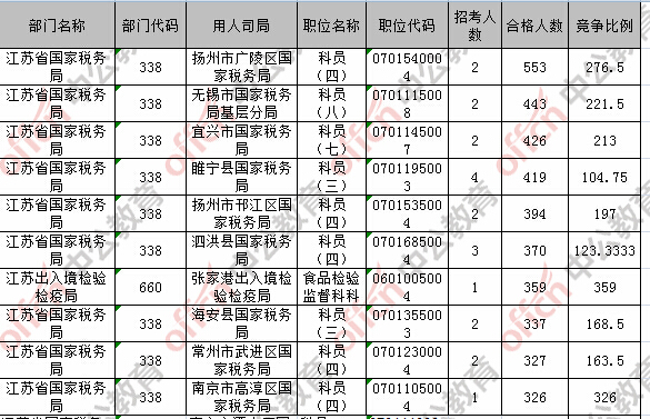 報(bào)名通過審核人數(shù)前十的職位主要集中在江蘇省國家稅務(wù)局、江蘇出入境檢驗(yàn)檢疫局,具體信息如下: