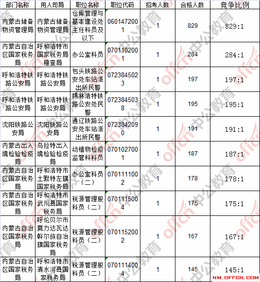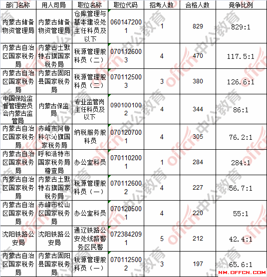 報(bào)名通過審核人數(shù)前十的職位主要集中在內(nèi)蒙古儲備物資管理局、內(nèi)蒙古固陽縣國家稅務(wù)局、內(nèi)蒙古土默特右旗國家稅務(wù)局等部門,具體信息如下: