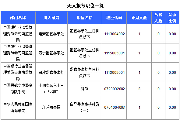 截至21日16時(shí),海南地區(qū)仍有12個(gè)職位無人報(bào)考。下面列舉部分職位展示,中公網(wǎng)校專家建議廣大考生多關(guān)注一些較冷職位,避免激烈競(jìng)爭(zhēng),結(jié)合自身?xiàng)l件,找到屬于自己的職位。
