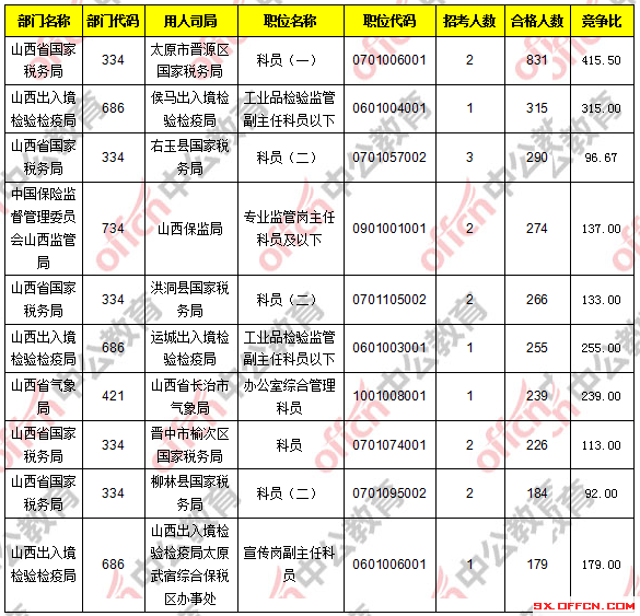 報考人數(shù)前十的職位主要集中在山西省國家稅務局、山西出入境檢驗檢疫局這兩個部門,具體信息如下: