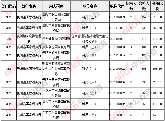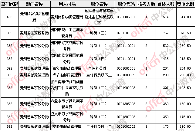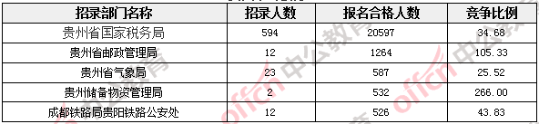報名通過審核人數(shù)較多的職位主要集中在貴州省國家稅務局、貴州儲備物資管理局兩大部門,具體信息如下: