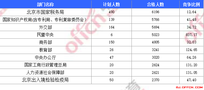 為幫助廣大考生更清晰的了解今日報名情況,北京中公網(wǎng)校整理了合格人數(shù)前十位的部門以及競爭比例最激烈的十大部門,供廣大考生參考: