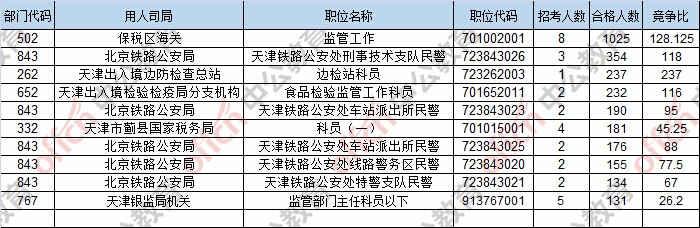 報名通過審核人數(shù)前十的職位主要集中在保稅區(qū)海關(guān)、北京鐵路公安局、天津出入境邊防檢查總站,具體信息如下: