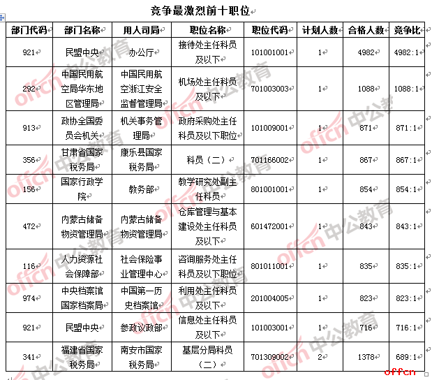 從競爭比上來看,與去年同期只有7個(gè)部門超過800:1相比,今年有8個(gè)職位“順利過關(guān)”。但從整體上來看,今年報(bào)考職位的“熱冷兩重天”的特點(diǎn)突顯,最熱職位或可超5000大關(guān),而在競爭比排行榜中排名第二的職位僅1088:1,兩者可謂“天淵之別”。