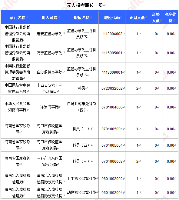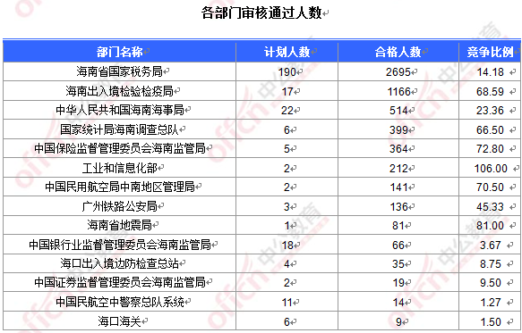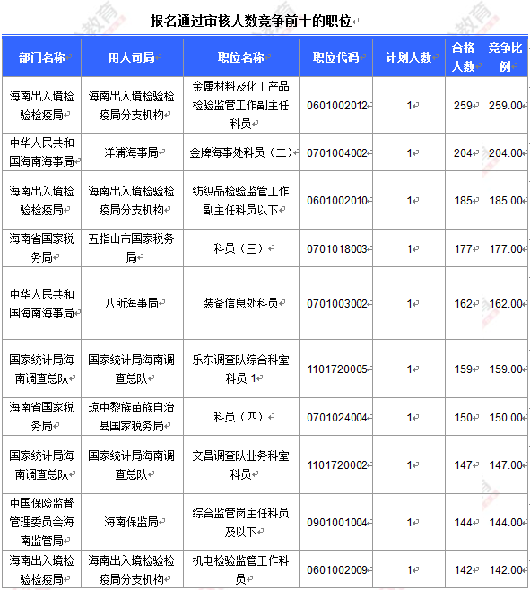 報名通過審核人數(shù)前十的職位主要集中在海南出入境檢驗檢疫局、海南省國家稅務局、中華人民共和國海南海事局等部門,具體信息如下:
