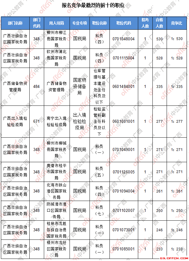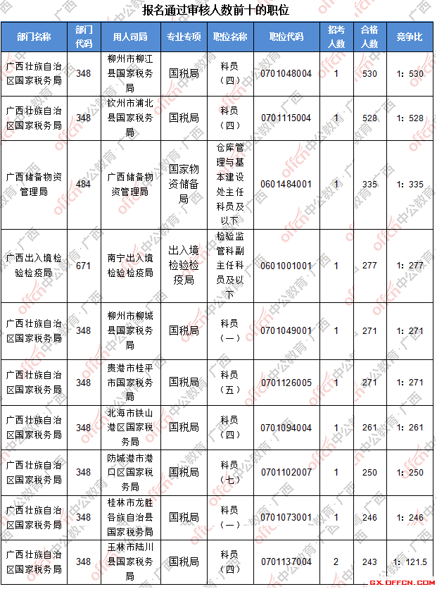 報名通過審核人數(shù)前十的職位主要集中在廣西壯族自治區(qū)國家稅務(wù)局、廣西儲備物資管理局、廣西出入境檢驗檢疫局等部門,具體信息如下: