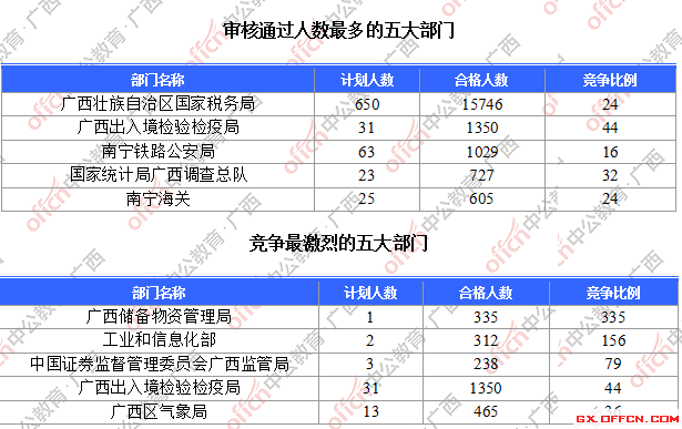 為幫助廣大考生更清晰的了解今日報名情況,廣西中公教育整理了審核通過人數(shù)前五位的部門以及競爭比例最激烈的五大部門,供廣大考生參考: