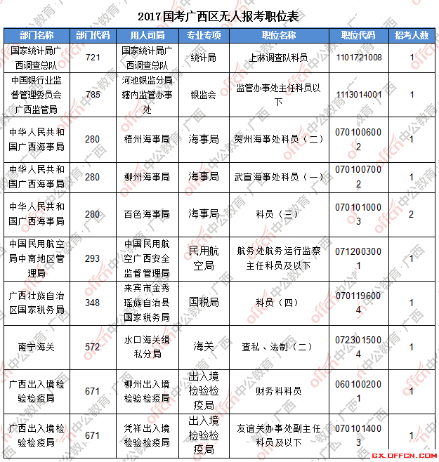 截至22日8時,據(jù)廣西中公教育統(tǒng)計,2017國考招錄職位中工作地點在廣西的職位通過審核總?cè)藬?shù)為21665人,僅剩10個職位無人通過審核。