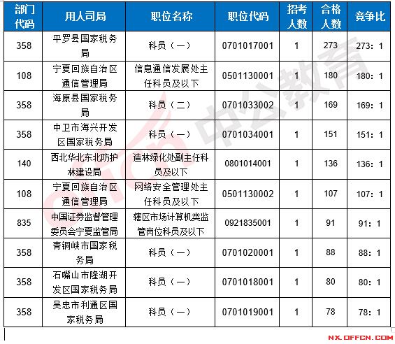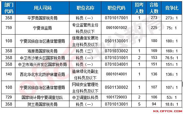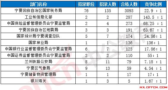 截至22日8時(shí),據(jù)寧夏中公教育統(tǒng)計(jì),2017國考招錄職位中工作地點(diǎn)在寧夏的職位審核合格總?cè)藬?shù)為4549人,所有職位均有人報(bào)考,其中6職位競爭比低于面試比例,平均競爭比例為28.8:1 。