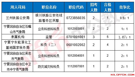 截止到22日8時(shí),工作地點(diǎn)在寧夏的職位均有人報(bào)考,其中6職位競爭比低于面試比例。下面是爭比例低于面試比例職位一覽表,中公教育專家建議廣大考生多關(guān)注一些較冷職位,避免激烈競爭,結(jié)合自身?xiàng)l件,找到屬于自己的職位。