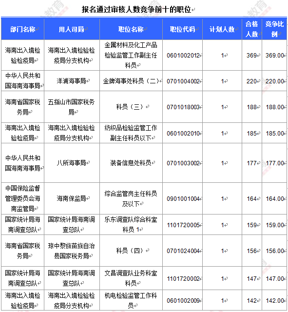 報(bào)名通過審核人數(shù)前十的職位主要集中在海南出入境檢驗(yàn)檢疫局、海南省國(guó)家稅務(wù)局、中華人民共和國(guó)海南海事局等部門,具體信息如下: