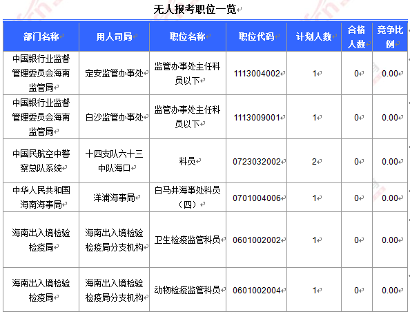 截止到22日16時(shí),工作地點(diǎn)在海南的職位仍有6個(gè)無人報(bào)考。海南中公教育提醒廣大考生,多關(guān)注無人報(bào)名職位,會(huì)大大降低競(jìng)爭(zhēng)。