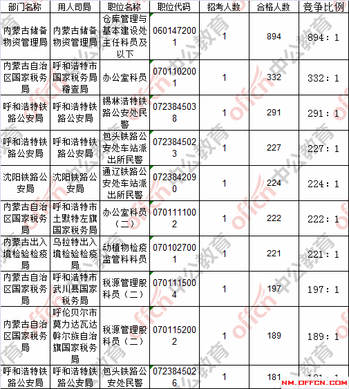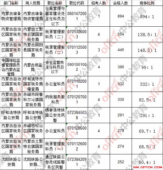 報(bào)名通過審核人數(shù)前十的職位主要集中在內(nèi)蒙古儲(chǔ)備物資管理局、內(nèi)蒙古固陽縣國家稅務(wù)局、內(nèi)蒙古土默特右旗國家稅務(wù)局等部門,具體信息如下: