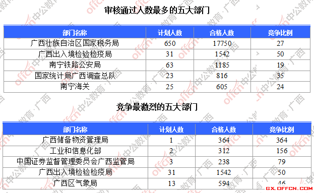 為幫助廣大考生更清晰的了解今日?qǐng)?bào)名情況,廣西中公教育整理了審核通過人數(shù)前五位的部門以及競爭比例最激烈的五大部門,供廣大考生參考: