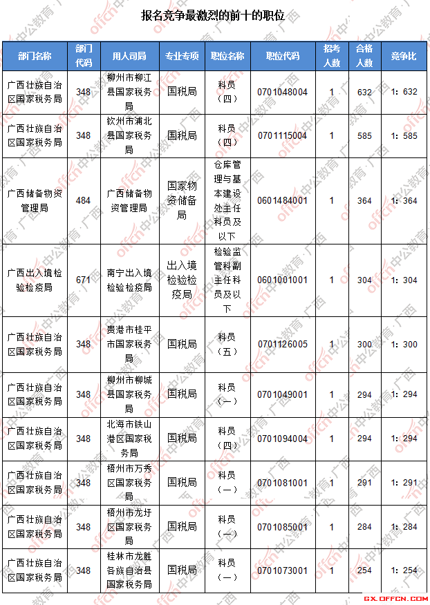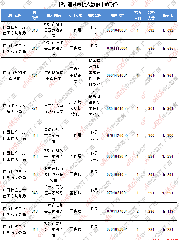 報(bào)名通過審核人數(shù)前十的職位主要集中在廣西壯族自治區(qū)國家稅務(wù)局、廣西儲(chǔ)備物資管理局、廣西出入境檢驗(yàn)檢疫局等部門,具體信息如下: