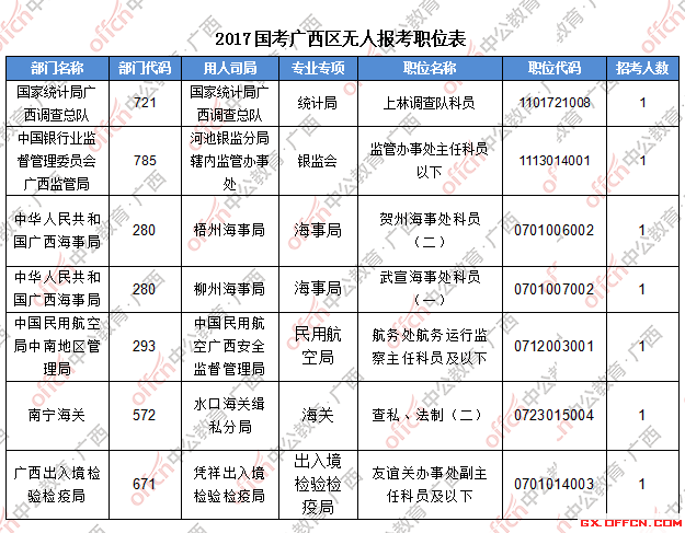 截止到22日16時(shí),工作地點(diǎn)在廣西的職位共有7個(gè)無人報(bào)考,僅占全部職位的1%。下面是部分廣西無人報(bào)考職位一覽表,廣西中公教育專家建議廣大考生結(jié)合自身?xiàng)l件,根據(jù)自己的實(shí)際情況找到屬于自己的職位,避免激烈競爭。