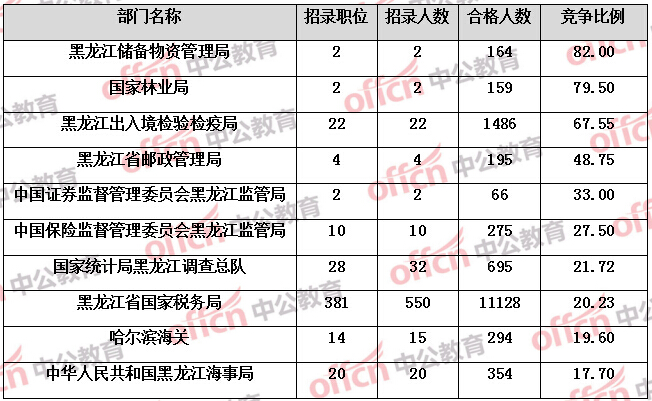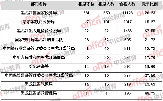 為幫助廣大考生更清晰的了解今日報名情況,黑龍江中公教育整理了審核通過人數(shù)前六位的部門以及競爭比例最激烈的十大部門,供廣大考生參考: