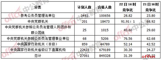 據(jù)中公教育數(shù)據(jù)統(tǒng)計,截至22日16時,經(jīng)過了近8天的報名后,報名系統(tǒng)已經(jīng)審核通過了849328人,超出去年同期5萬人左右,平均競爭比為31.38:1,高出去年同期的28.8:1。從單日增長量來看,較21日下午同期增加了166899人。從各系統(tǒng)來看,中央黨群機(jī)關(guān)競爭比,已達(dá)到91.91:1。目前仍有490個崗位報考人數(shù)還未破零,占3.14%。