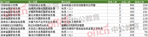 截止到23日8時,競爭比例的職位為吉林鐵路公安處線路警務區(qū)民警一職,招錄4人,截止到23日8時通過人數(shù)為894人。其次為吉林省國稅局部門。