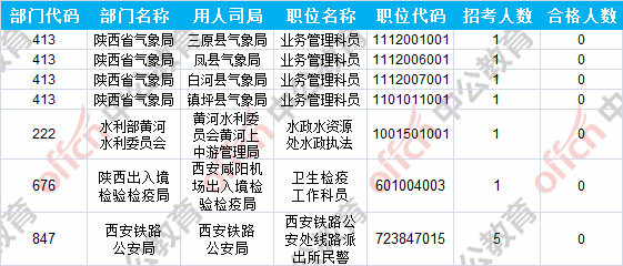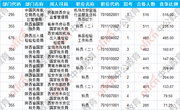 報名通過審核人數(shù)前十的職位主要集中在陜西出入境檢驗檢疫局、陜西省國家稅務(wù)局、中國民用航空局西北地區(qū)管理局等部門,具體信息如下: