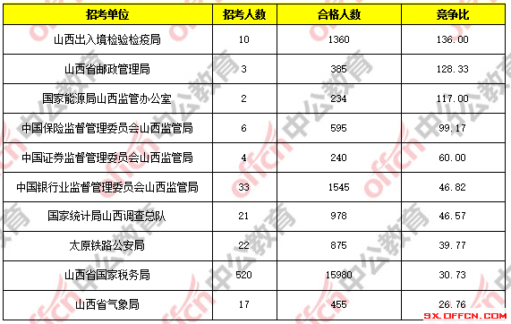 為幫助廣大考生更清晰的了解今日報名情況,山西中公網(wǎng)校整理了合格人數(shù)前十位的部門以及競爭比例最激烈的十大部門,供廣大考生參考: