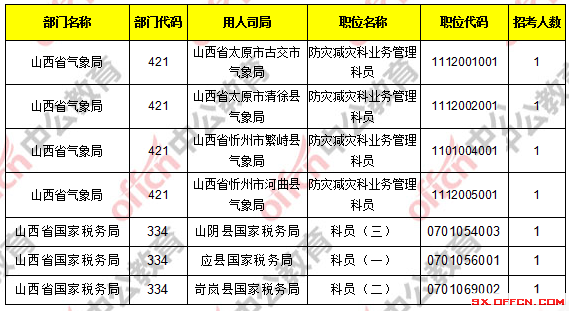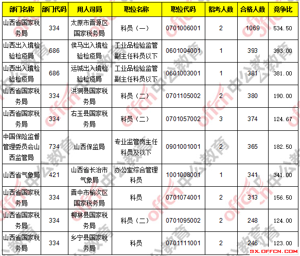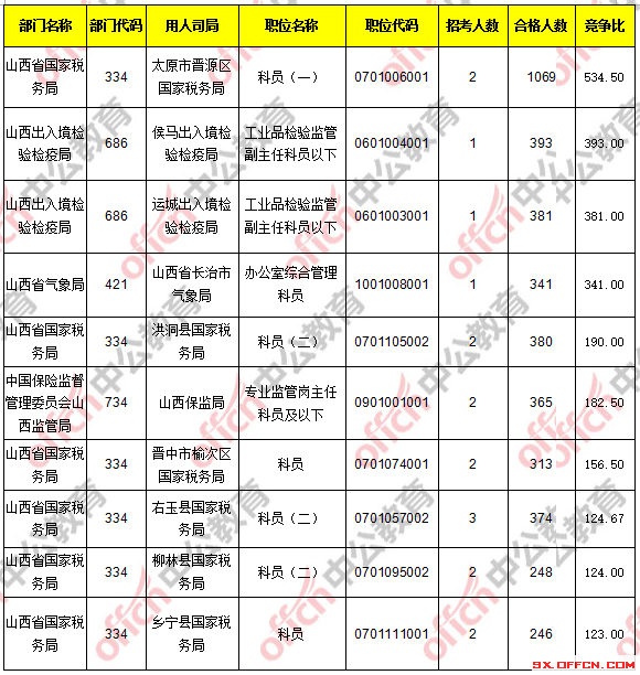 報考人數(shù)前十的職位主要集中在山西省國家稅務(wù)局、山西出入境檢驗(yàn)檢疫局這兩個部門,具體信息如下:
