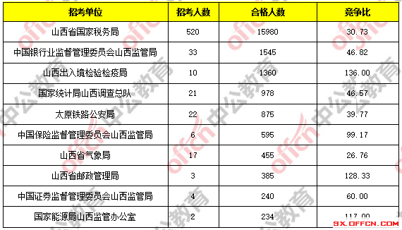 截至23日16時,據(jù)山西中公網(wǎng)校統(tǒng)計,2017國考招錄職位中工作地點(diǎn)在山西的職位通過審核總?cè)藬?shù)為22396人,共有7個職位無人報考,平均競爭比例為33.81:1。