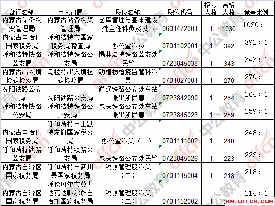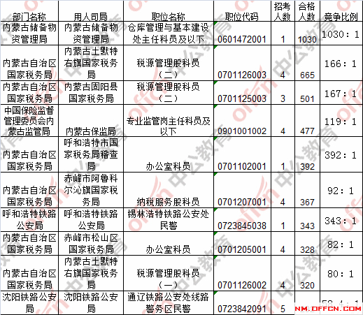 報名通過審核人數(shù)前十的職位主要集中在內(nèi)蒙古儲備物資管理局、內(nèi)蒙古土默特右旗國家稅務(wù)局、內(nèi)蒙古固陽縣國家稅務(wù)局等部門,具體信息如下: