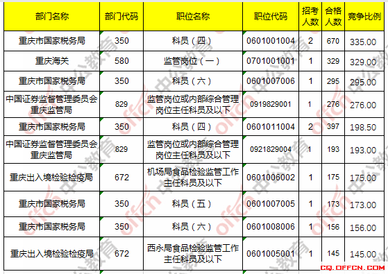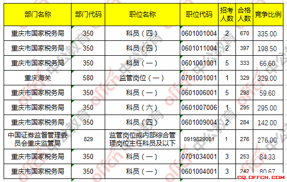 合格人數(shù)前十的職位主要集中在重慶市國(guó)家稅務(wù)局、重慶海關(guān)、中國(guó)證券監(jiān)督管理委員會(huì)重慶監(jiān)管局等部門,具體信息如下: