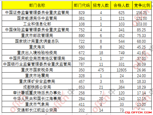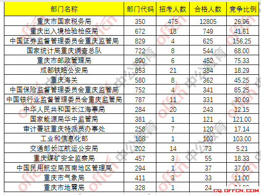 為幫助廣大考生更清晰的了解今日?qǐng)?bào)名情況,北京中公網(wǎng)校整理了重慶各個(gè)部門合格人數(shù)以及競(jìng)爭(zhēng)比例,供廣大考生參考: