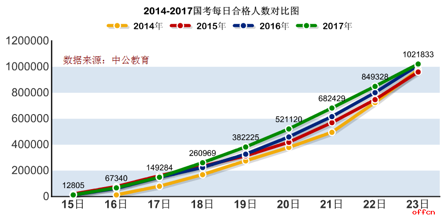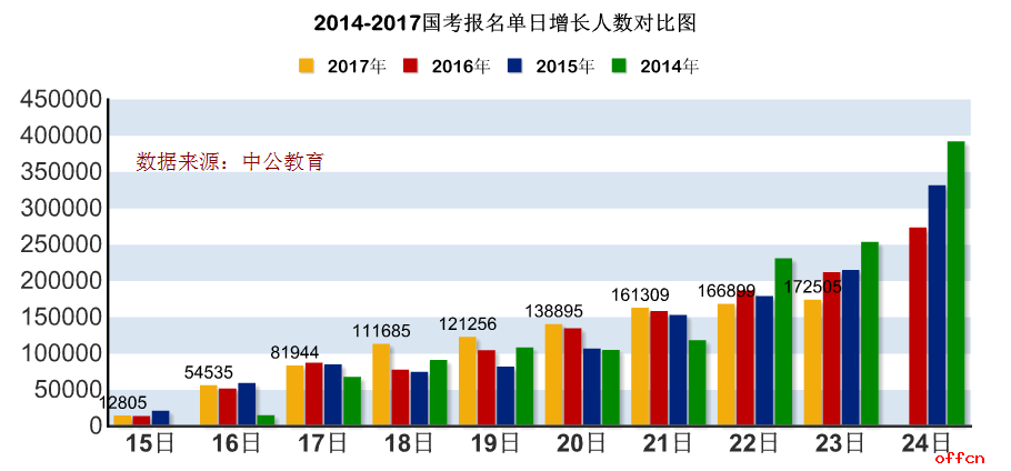 另外,中公網(wǎng)校專家分析,從報名每日合格人數(shù)四年對比情況來看,今年每日合格人數(shù)均超過歷史值的2014年,可以大膽,今年報名人數(shù)或趕超2014國考,成為歷史值。