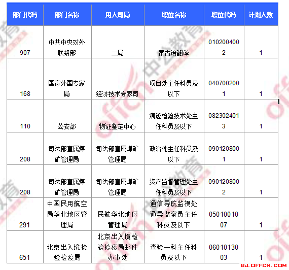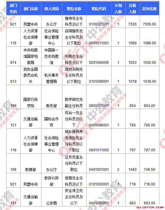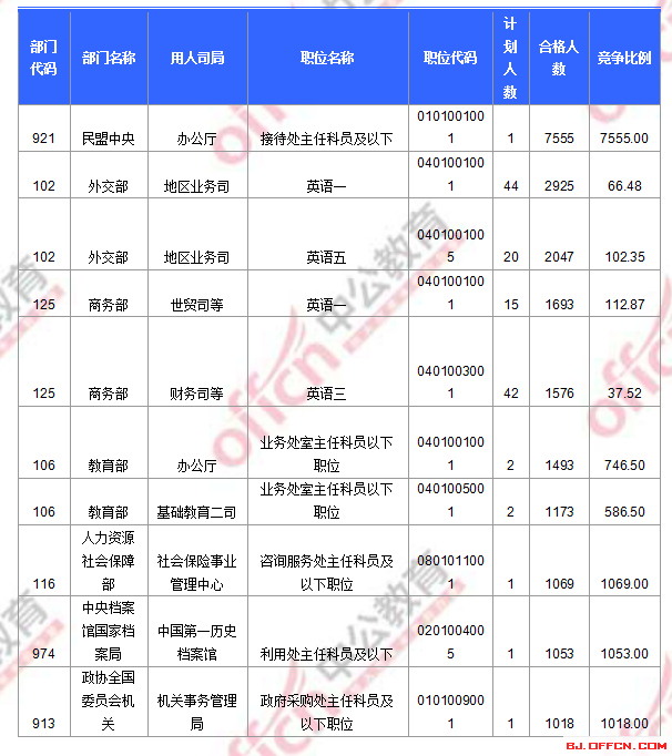 合格人數(shù)前十的職位主要集中在民盟中央、外交部、商務(wù)部等部門,具體信息如下: