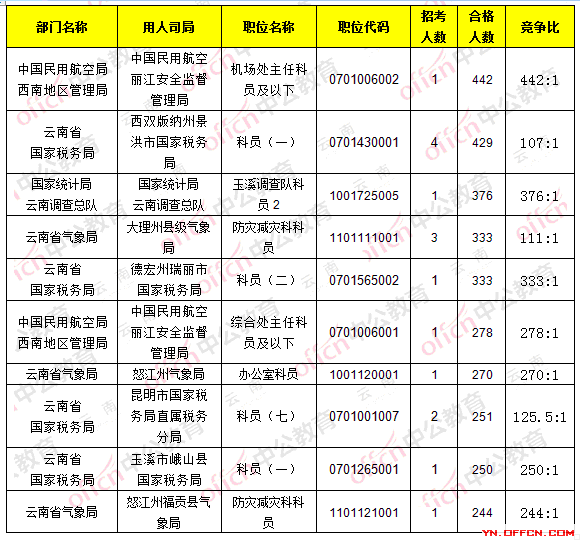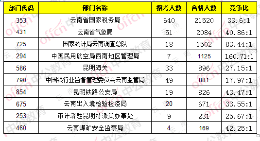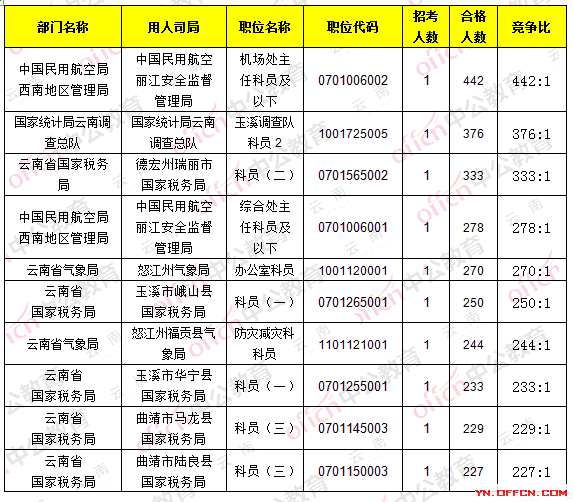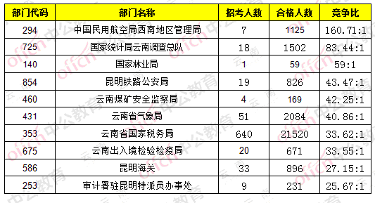 報(bào)名通過審核人數(shù)前十的職位主要集中在中國民用航空局西南地區(qū)管理局、云南省國家稅務(wù)局、國家統(tǒng)計(jì)局云南調(diào)查總隊(duì)等部門,具體信息如下: