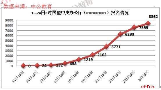 2017國考已進入尾聲,民盟中央辦公廳接待處主任科員及以下(職位代碼為101001001)一職在19日摘得“雙冠”之后,以難以抵擋的“誘惑”,吸引這眾多考生的“蜂擁而至”,穩(wěn)居“人氣”的“頭把交椅”。截止到24日8時,該職位報名合格人數(shù)已增至8362人,報名人數(shù)如此之多,令人咂舌,雖然錄取的幾率渺茫,但絲毫擋不住社會人員對此職位的“向往”,中公教育專家預計,在報名最后一天中,此職位報考人數(shù)的數(shù)值絕不會停滯,而是會“勇往直前”,或可出現(xiàn)“井噴”。
