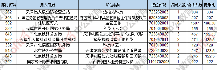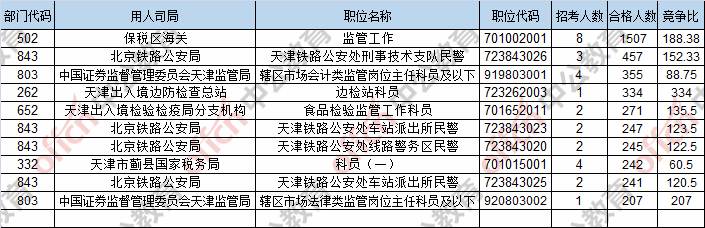 報名通過審核人數(shù)前十的職位主要集中在保稅區(qū)海關(guān)、北京鐵路公安局、中國證券監(jiān)督管理委員會天津監(jiān)管局,具體信息如下: