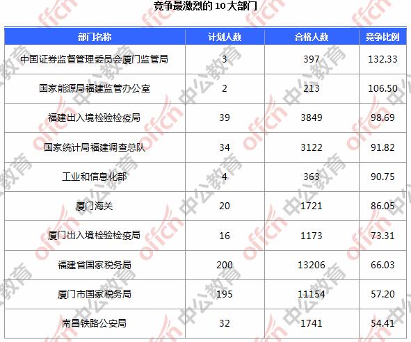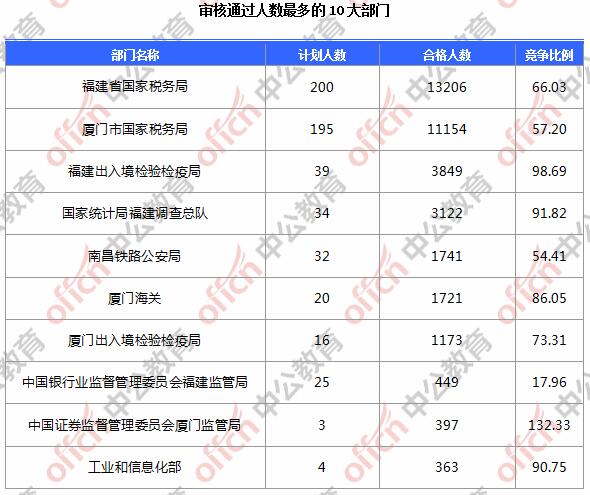 為幫助廣大考生更清晰的了解今日?qǐng)?bào)名情況,福建中公網(wǎng)校整理了審核通過人數(shù)前10位的部門以及競爭比例最激烈的10大部門,供廣大考生參考: