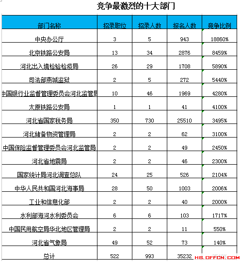 為幫助廣大考生更清晰的了解今日報名情況,河北中公網(wǎng)校整理了審核通過人數(shù)前十位的部門以及競爭比例最激烈的十大部門,供廣大考生參考