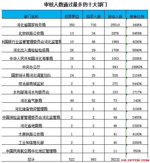 截止到24日8時,通過審核人數(shù)前三位的部門依次是:河北省國家稅務(wù)局、北京鐵路公安局、中國銀行業(yè)監(jiān)督管理委員會河北監(jiān)管局,三部門通過審核總?cè)藬?shù)達(dá)30355人,占通過審核總?cè)藬?shù)的86%。
