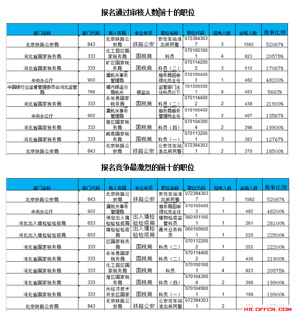 報名通過審核人數(shù)前十的職位主要集中在北京鐵路公安局、河北省國家稅務(wù)局、中央辦公廳等部門,具體信息如下:
