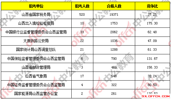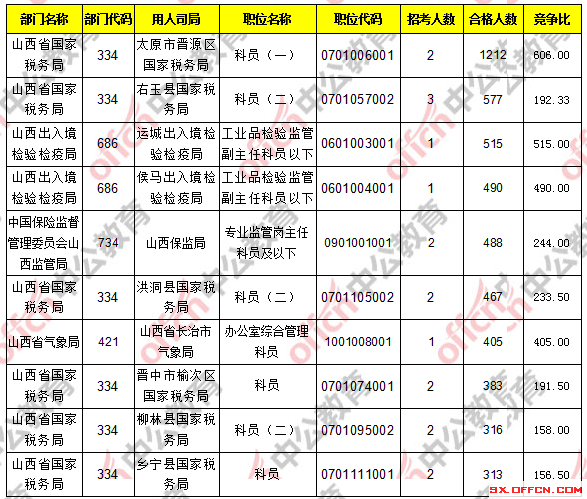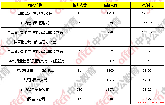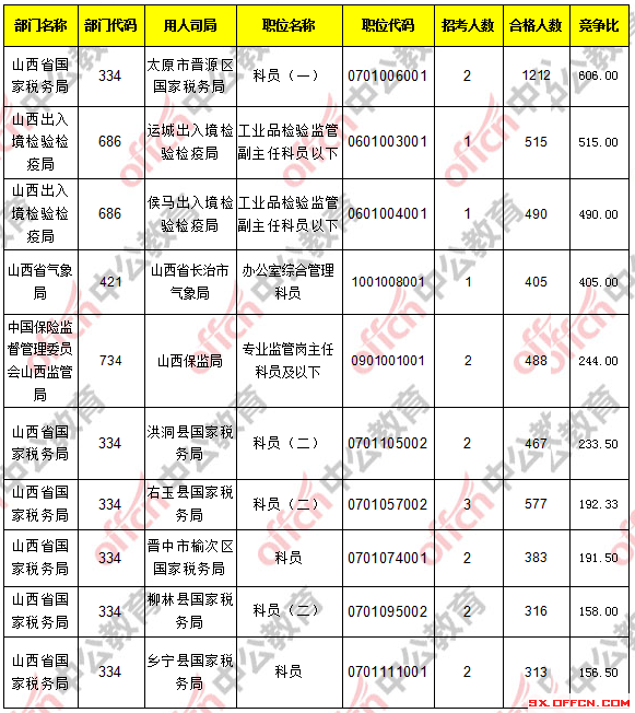 報考人數(shù)前十的職位主要集中在山西省國家稅務局、山西出入境檢驗檢疫局這兩個部門,具體信息如下: