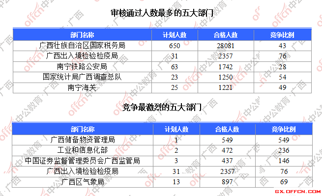 為幫助廣大考生更清晰的了解2017國考報名情況,廣西中公網(wǎng)校整理了審核通過人數(shù)前五位的部門以及競爭比例最激烈的五大部門,供廣大考生參考: