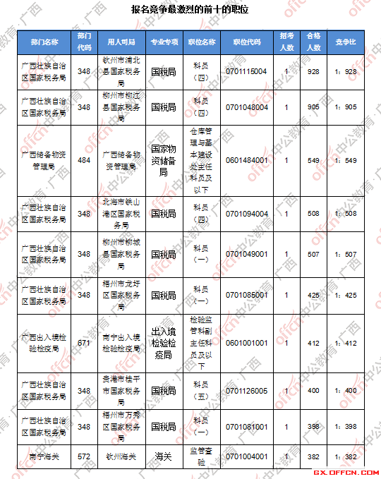 截止到24日17時30分,競爭比例的職位為欽州市浦北縣國家稅務(wù)局科員(四)一職,招錄1人,通過人數(shù)為928人,競爭比例928:1。