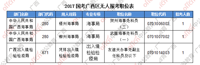 截止到24日17時30分,工作地點在廣西的職位共有3個無人報考,僅占全部職位的0.46%。下面是部分廣西無人報考職位一覽表。