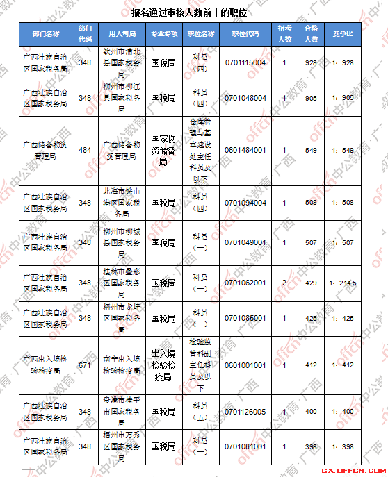 報名通過審核人數(shù)前十的職位主要集中在廣西壯族自治區(qū)國家稅務(wù)局、廣西儲備物資管理局、廣西出入境檢驗檢疫局等部門,具體信息如下: