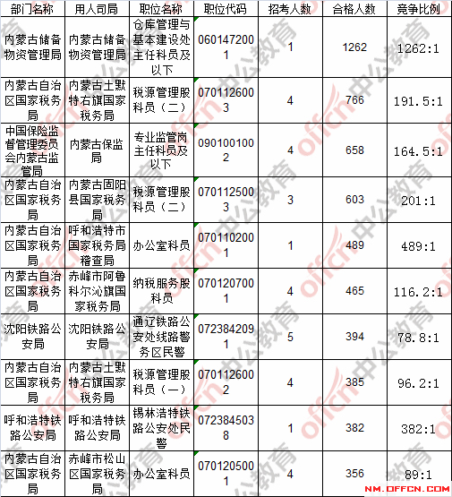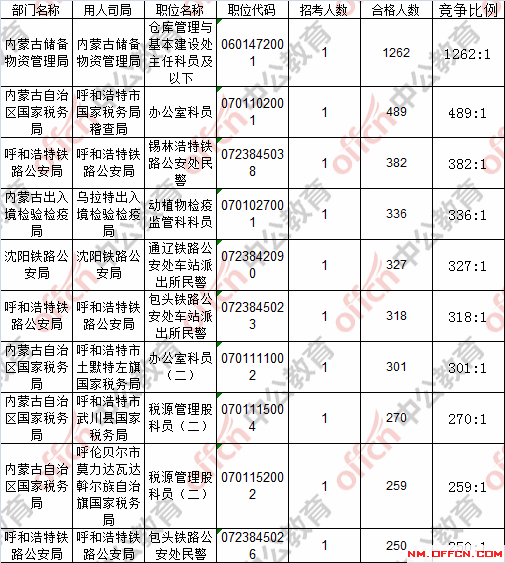 報(bào)名通過審核人數(shù)前十的職位主要集中在內(nèi)蒙古儲(chǔ)備物資管理局、內(nèi)蒙古土默特右旗國(guó)家稅務(wù)局、內(nèi)蒙古固陽縣國(guó)家稅務(wù)局等部門,具體信息如下: