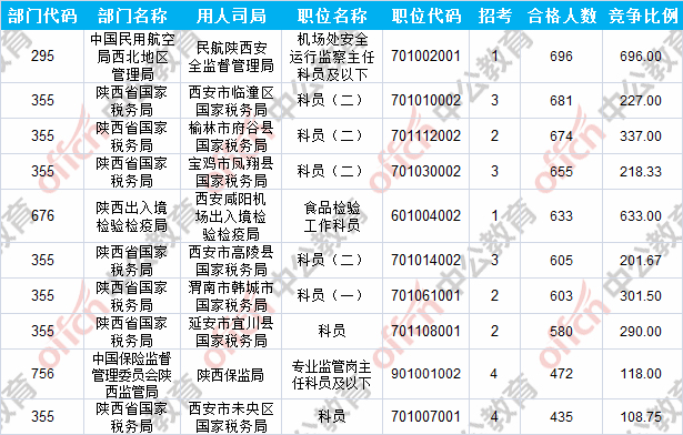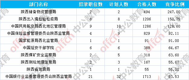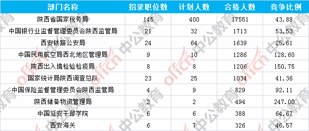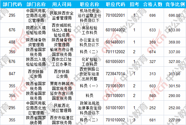 報(bào)名通過審核人數(shù)前十的職位主要集中在中國民用航空局西北地區(qū)管理局、陜西省國家稅務(wù)局、陜西出入境檢驗(yàn)檢疫局等部門,具體信息如下: