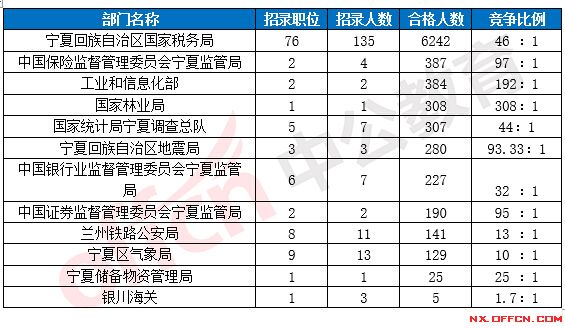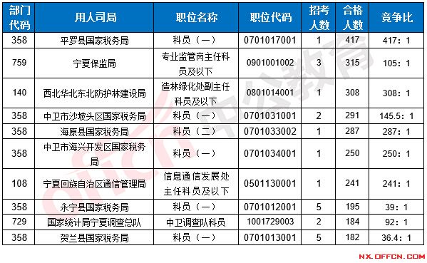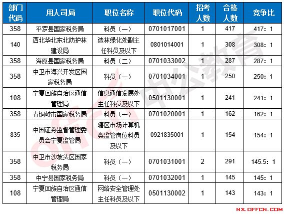 合格人數(shù)前十的職位主要集中在寧夏回族自治區(qū)國家稅務局、工業(yè)和信息化部、國家林業(yè)局等部門,具體信息如下: