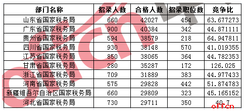 2017國家公務員考試報名階段已于24日18時落下帷幕,截止24日17時30分,共計1338698人通過審核,競爭比49.5:1,仍有223個職位無人報考。從中公網(wǎng)校統(tǒng)計出來的數(shù)據(jù)可以看到,2017國考報名最多的十大部門全部來自國稅系統(tǒng),山東國稅局以42027人通過審核位列第一,廣東國稅局、貴州國稅局分別以40384、38579人位列第二、第三位,這十大部門總共報考353727人,占總報名人數(shù)的26.4%。