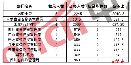 2017國考競爭最激烈部門毫無懸念由民盟中央獲得,該部門僅招錄6人,合格人數(shù)已經(jīng)12245:1,競爭比達2040:1,這也是因為報考職位出自民盟中央,以此拉高了整體競爭比例,除此以外,儲備物資管理局也是考生競爭的部門,競爭最激烈的十大部門中,就有六個來自此系統(tǒng),競爭比達687.5:1。